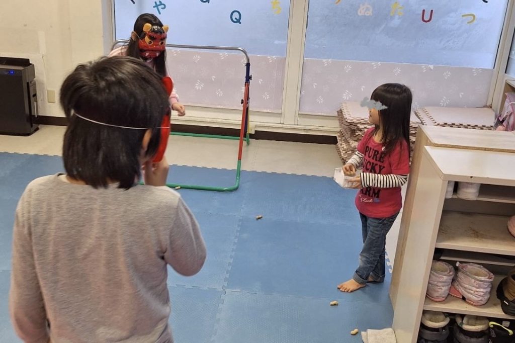 豆まき前には、「鬼が怖いから豆まきしたくない」と話していた未就学の子も、鬼役が友達だと分かり、楽しんで参加していました😊